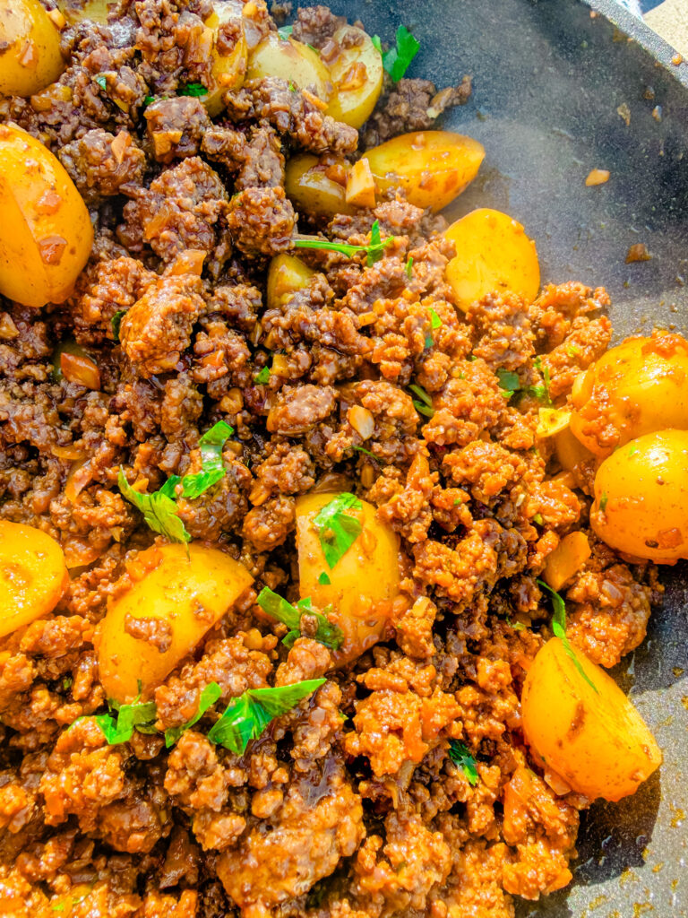 Baby potatoes are perfect for this recipe because they cook quickly and hold their shape well when mixed with the ground beef. Their thin skins also mean there’s no need to peel them, which keeps the recipe simple and weeknight-friendly.